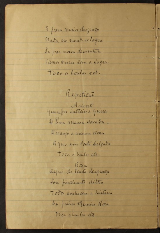 Folha do caderno manuscrito da "Opereta em Férias". O texto foi escrito com uma caneta de tinta preta.