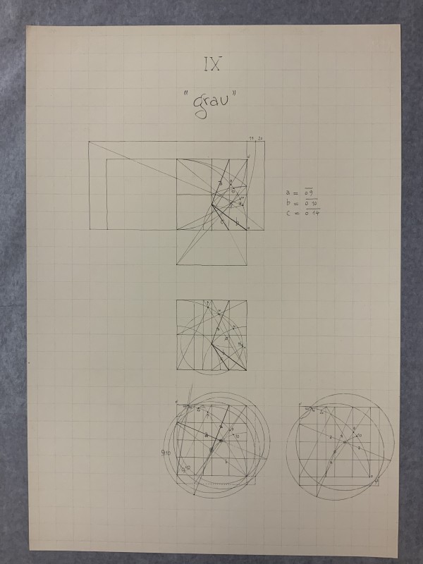 Estudo geométrico para a determinação de um grau da circunferência a partir da sua divisão em 9,10 e 7 partes iguais (IX). Este traçado geométrico serve a pintura de 1957 “Relação 9/10.