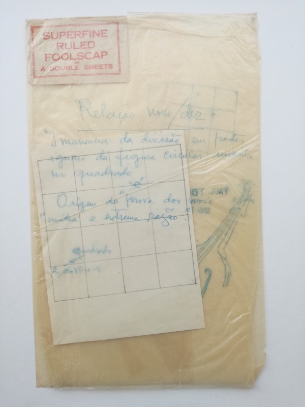 Breve trecho de texto (“imanencia da divissão em partes iguais da figura circular inscrita no quadrado[…]”e dois esboços inacabados, um geométrico e outro de um violoncelo, este último ao lado da referência “PAUL TORTELIER /violoncelista francês”.